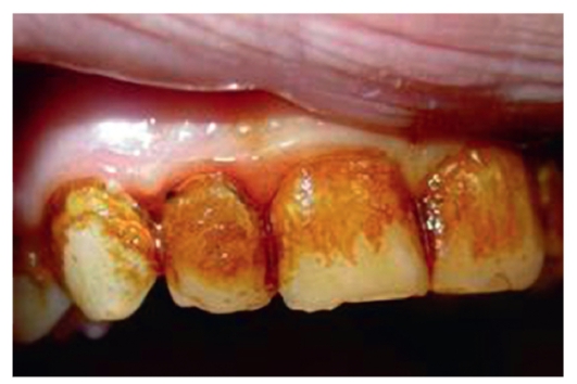 • наличие зубного налета (неудовлетворительный гигиенический уход за полостью рта);