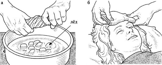 Рис. 7-1. Применение компресса: а - смачивание марли в холодной воде (со льдом); б - наложение компресса на лоб больной