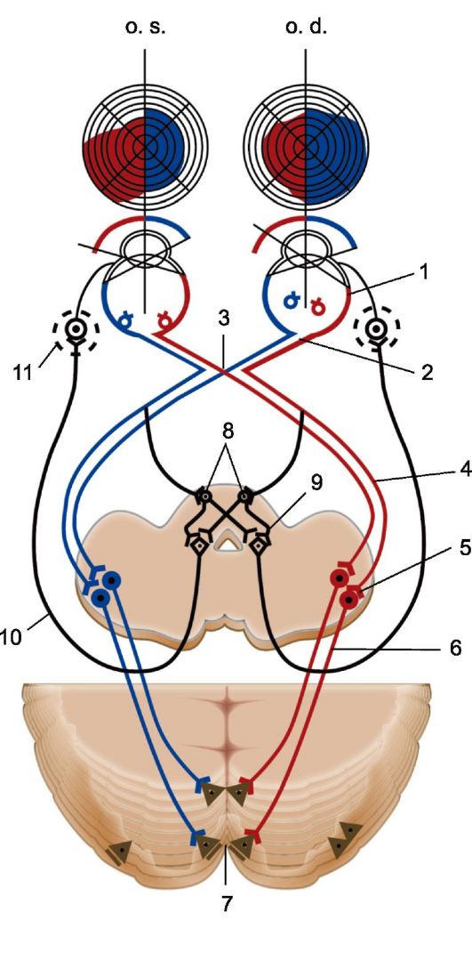 В хиазме перекрест совершают только те волокна зрительных нервов, которые передают импульсы от внутренних половин сетчатой оболочки глаз. Аксоны же ганглиозных клеток, находящихся в латеральных половинах сетчатки, не подвергаются перекресту и, проходя через хиазму, лишь огибают снаружи участвующие в формировании перекреста волокна, составляя его латеральные отделы. Нервные волокна, несущие зрительную информацию от желтого пятна, составляют около 1/3 волокон зрительного нерва; проходя в составе хиазмы, они также совершают частичный перекрест, разделяясь на перекрещенные и