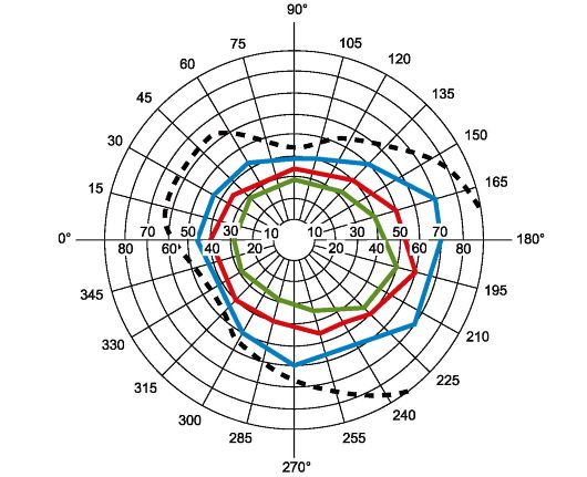 Пунктиром изображено поле зрения на белый цвет, цветными линиями - на соответствующие цвета.