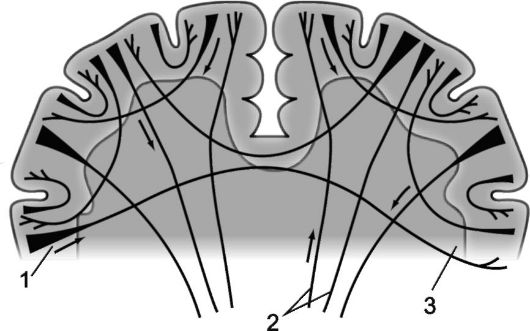 1 - проекционные волокна; 2 - комиссуральные волокна; 3 - ассоциативные волокна.