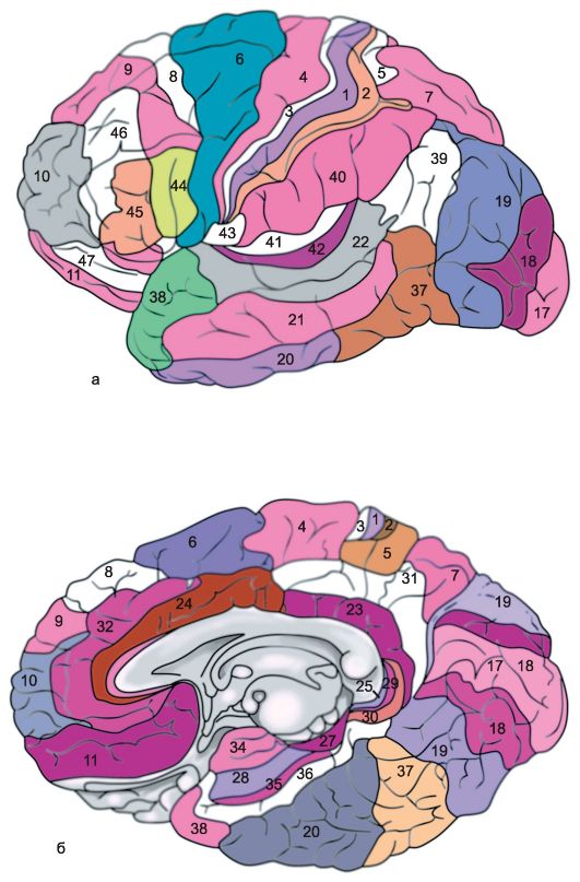 Рис. 14.6. Архитектонические поля коры больших полушарий [по Бродману]. а - наружная поверхность; б - медиальная поверхность.