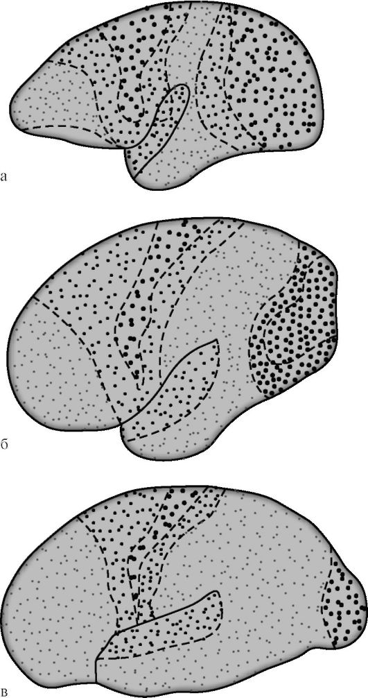 Рис. 14.7. Дифференциация проекционных и ассоциативных зон коры больших полушарий в процессе эволюции приматов [по Г.И. Полякову]. а - мозг низшей обезьяны; б - мозг высшей обезьяны; в - мозг человека. Крупными точками обозначены проекционные зоны, мелкими - ассоциативные. У низших обезьян ассоциативные зоны занимают 10% площади коры, у высших - 20%, у человека - 50%.