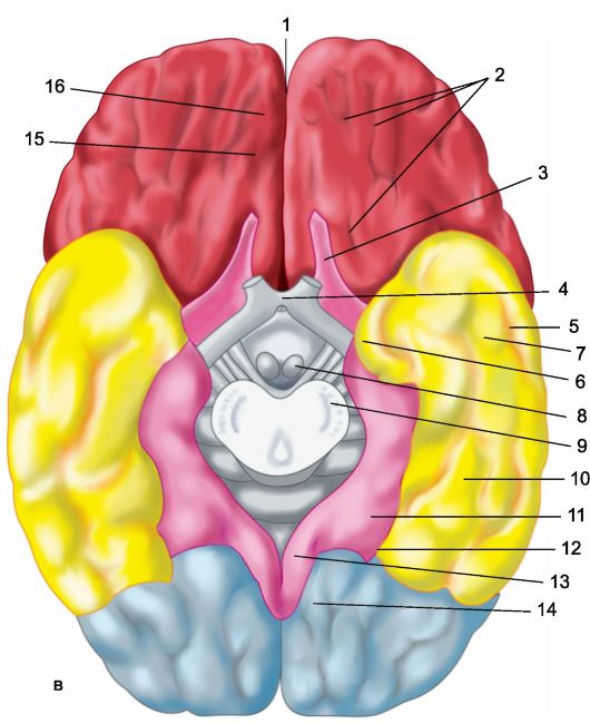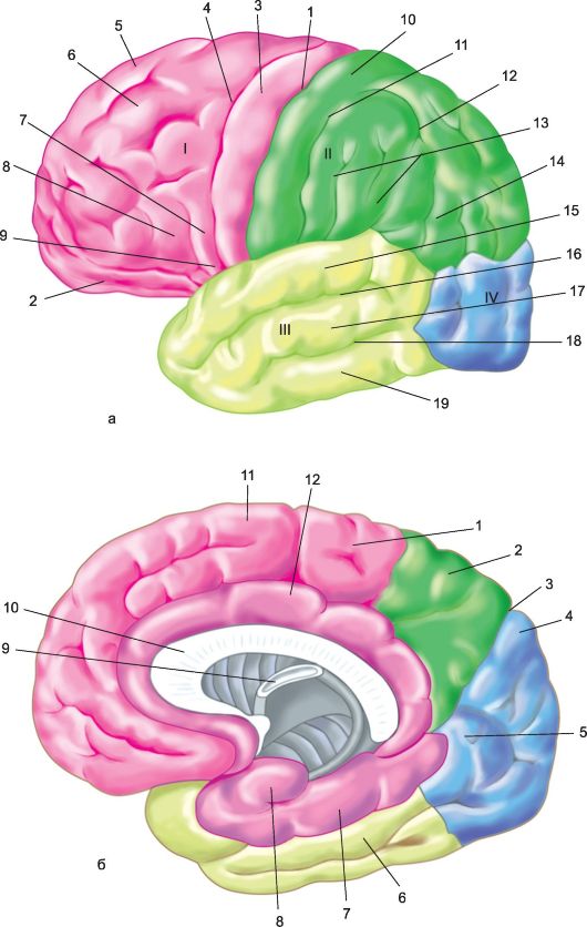 а - верхнелатеральная поверхность левого полушария: 1 - центральная борозда; 2 - глазничная часть нижней лобной извилины; I - лобная доля; 3 - прецентральная извилина; 4 - прецентральная борозда; 5 - верхняя лобная извилина; 6 - средняя лобная извилина; 7 - покрышечная часть нижней лобной извилины; 8 - нижняя лобная извилина; 9 - латеральная борозда; II - теменная доля: 10 - постцентральная извилина; 11 - постцентральная борозда; 12 - внутритеменная борозда; 13 - надкраевая извилина; 14 - угловая извилина; III - височная доля: 15 - верхняя височная извилина; 16 - верхняя височная борозда; 17 - средняя височная извилина; 18 - средняя височная борозда; 19 - нижняя височная извилина; IV - затылочная доля: б - медиальная поверхность правого полушария: 1 - парацентральная долька, 2 - предклинье; 3 - теменно-затылочная борозда; 4 - клин, 5 - язычная извилина; 6 - латеральная затылочно-височная извилина; 7 - парагиппокампальная извилина; 8 - крючок; 9 - свод; 10 - мозолистое тело; 11 - верхняя лобная извилина; 12 - поясная извилина; в - нижняя поверхность больших полушарий: 1 - продольная межполушарная щель; 2 - глазничные борозды; 3 - обонятельный нерв; 4 - зрительный перекрест; 5 - средняя височная борозда; 6 - крючок; 7 - нижняя височная извилина; 8 - сосцевидное тело; 9 - основание ножки мозга; 10 - латеральная затылочно-височная извилина; 11 - парагиппокампальная извилина; 12 - коллатеральная борозда; 13 - поясная извилина; 14 - язычная извилина; 15 - обонятельная борозда; 16 - прямая извилина.