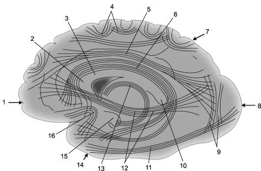 1 - лобная доля; 2 - колено мозолистого тела; 3 - мозолистое тело; 4 - дугообразные волокна; 5 - верхний продольный пучок; 6 - поясная извилина; 7 - теменная доля, 8 - затылочная доля; 9 - вертикальные пучки Вернике; 10 - валик мозолистого тела;