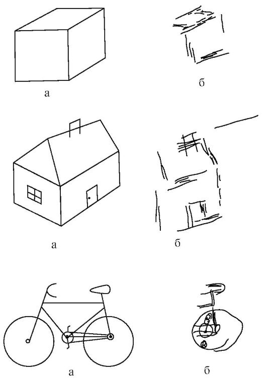 а - предлагаемые больному рисунки; б - попытки скопировать эти рисунки больным с поражением правой теменной доли, игнорирующим левую половину пространства.