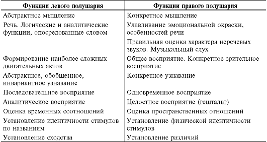 В процессе развития ВПФ одно из полушарий, называемое доминантным (обычно левое), специализируется на обеспечении абстрактного мышления и речи - функций, свойственных только человеку. Левое полушарие, кроме того, оказалось ведущим в формировании наиболее сложных абстрактных психических процессов. Развитие же правого полушария создает возможности совершенствовать конкретное мышление, улавливать и адекватно оценивать особенности интонаций речи, воспринимать и дифференцировать неречевые звуки, в частности звуки музыки. Правое полушарие обеспечивает общее, зрительное и пространственное восприятие (табл. 15.1).