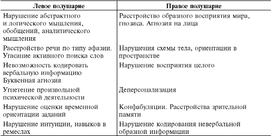 Таблица 15.2. Особенности нарушений психических функций при поражении левого и правого полушарий большого мозга