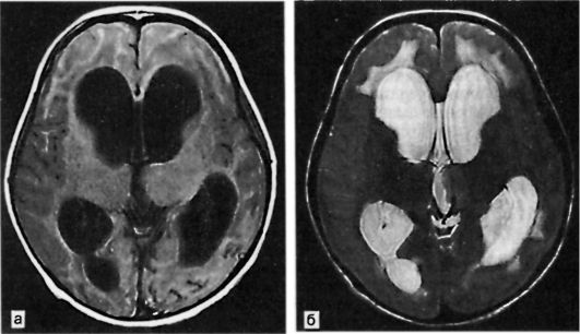 Рис. 20.2. МРТ головного мозга при гидроцефалии. а - в режиме Т1; б - в режиме Т2.