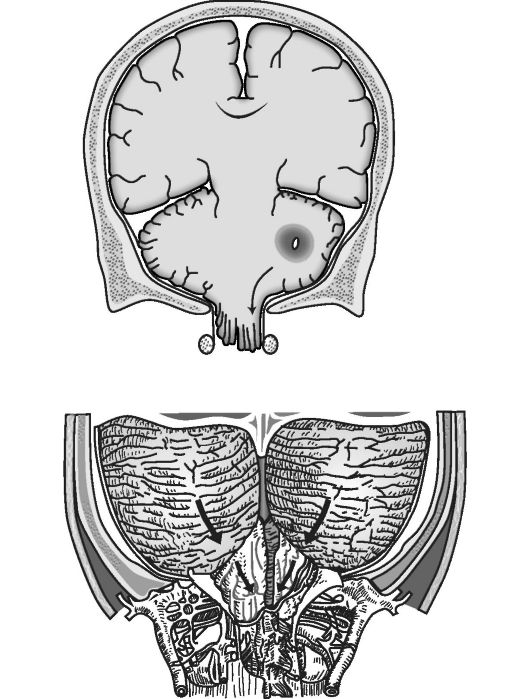 При объемных патологических процессах в субтенториальном пространстве в связи с нарастающим развитием в нем высокого давления происходит смещение в сторону позвоночного канала мозговых структур, прежде всего миндалин мозжечка, и вклинение их между краем большого затылочного отверстия и продолговатым мозгом (рис. 21.2). При вклинении миндалин мозжечка характерна