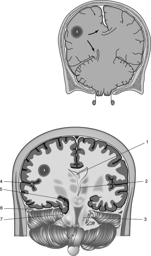 При смещении (дислокации) мозговой ткани в сторону, противоположную зоне более высокого давления, возможно придавливание не поврежденных ранее мозговых структур, расположенных на значительном расстоянии от основного патологического очага и до этого сохраняющих свои функции, к костям черепа или к дубликатурам твердой мозговой оболочки, что, кроме нарастания выраженности общемозговой симптоматики, сопровождается появлением новых очаговых симптомов на расстоянии, существенно осложняющих клиническую картину. Особую опасность при этом составляет проникновение (вклинение) смещаемой ткани мозга в узкие пространства, ограниченные костной тканью или плотными краями таких дубликатур твердой мозговой оболочки, как сер- повидные отростки и намет мозжечка - вклинение их под серп большого мозга, в вырезку намета мозжечка или большое затылочное отверстие.