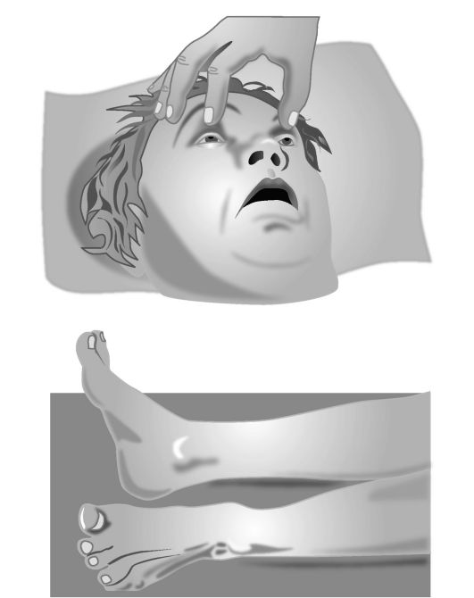 симптом «курения трубки»), снижением скулового рефлекса, более быстрым падением пассивно приподнимаемых конечностей, гипотонией мышц (в связи с этим на стороне гемиплегии «распластанное» бедро), ротацией стопы кнаружи (рис. 23.1), меньшей выраженностью симптома Кернига, похолоданием и цианозом конечностей, при этом сухожильные рефлексы на стороне геми-