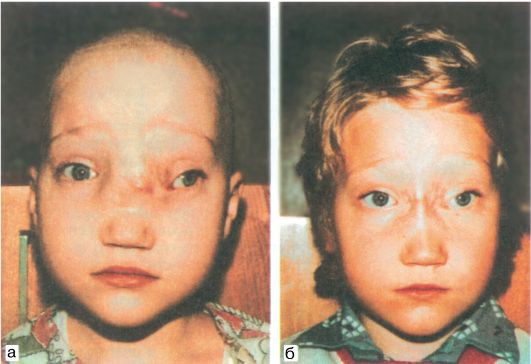 Рис. 24.5. Ребенок с назоорбитальной грыжей и гипертелоризмом до (а) и после (б) операции.