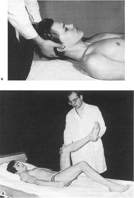 Рис. 32.1. Выявление менингеальных симптомов: а - ригидности затылочных мышц и верхнего симптома Брудзинского; б - симптома Кернига и нижнего симптома Брудзинского. Объяснение в тексте.