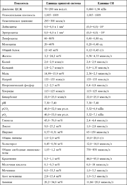 Таблица 32.1. Значения некоторых показателей ЦСЖ в норме (Цветанова Е.М., 1986, в сокращении)