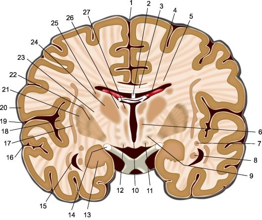 Рис 5.1. Фронтальный срез головного мозга на уровне сосцевидных тел. 1 - межполушарная продольная щель; 2 - свод; 3 - мозолистое тело; 4 - сосудистое сплетение бокового желудочка; 5 - лучистость мозолистого тела; 6 - медиальное ядро таламуса; 7 - хвост хвостатого ядра; 8 - гиппокамп; 9 - субталамическое ядро; 10 - III желудочек; 11 - сосцевидные тела; 12 - основание ножки мозга; 13 - миндалевидное тело; 14 - зрительный тракт; 15 - нижний рог бокового желудочка; 16 - верхняя височная борозда; 17 - ограда; 18 - островок; 19 - латеральная борозда, 20 - покрышка; 21 - скорлупа; 22 - бледный шар; 23 - внутренняя капсула; 24 - латеральные ядра таламуса; 25 - хвостатое ядро; 26 - мозговая пластинка таламуса; 27 - передние ядра таламуса.