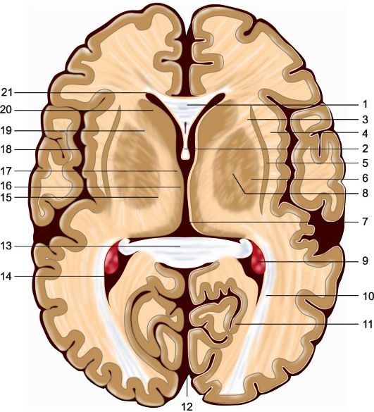 Рис 5.2. Горизонтальный срез головного мозга на уровне мозолистого тела. 1 - колено мозолистого тела; 2 - свод; 3 - наружная капсула; 4 - самая наружная капсула; 5 - ограда; 6 - чечевицеобразное ядро; 7 - III желудочек; 8 - внутренняя капсула; 9 - сосудистое сплетение бокового желудочка; 10 - задняя таламическая лучистость; 11 - шпорная борозда; 12 - продольная межполушарная щель; 13 - валик мозолистого тела; 14 - задний рог бокового желудочка; 15 - латеральные ядра таламуса; 16 - медиальные ядра таламуса; 17 - передние ядра таламуса; 18 - островок; 19 - внутренняя капсула