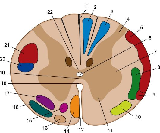 Рис. 8.1. Проводящие пути на поперечном срезе верхнегрудного отдела спинного мозга. 1 - задняя срединная перегородка; 2 - тонкий пучок; 3 - клиновидный пучок; 4 - задний рог; 5 - спиномозжечковый путь, 6 - центральный канал, 7 - боковой рог; 8 - латеральный спиноталамический путь; 9 - передний спиномозжечковый путь; 10 - передний спиноталамический путь; 11 - передний рог; 12 - передняя срединная щель; 13 - оливоспинномозговой путь; 14 - передний корково-спинномозговой (пирамидный) путь; 15 - передний ретикулярно-спинномозговой путь; 16 - преддверноспинномозговой путь; 17 - ретикулярно-спинномозговой путь; 18 - передняя белая спайка; 19 - серая спайка; 20 - красноядерно-спинномозговой путь; 21 - латеральный корково-спинномозговой (пирамидный) путь; 22 - задняя белая спайка.