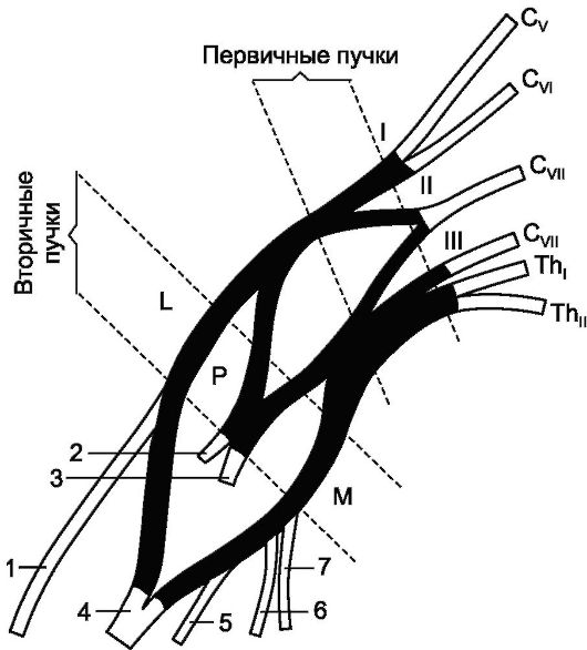 В соответствии с анатомическим строением плечевого сплетения различаются синдромы поражения его стволов (первичных пучков) и пучков (вторичных пучков).