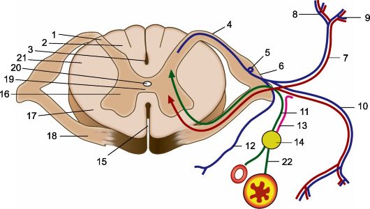 1 - задний рог; 2 - задний канатик; 3 - задняя срединная борозда; 4 - задний корешок; 5 - спинномозговой узел; 6 - ствол спинномозгового нерва; 7 - задняя ветвь спинномозгового нерва; 8 - внутренняя ветвь задней ветви; 9 - наружная ветвь задней ветви; 10 - передняя ветвь; 11 - белые соединительные ветви; 12 - оболочечная ветвь; 13 - серые соединительные ветви; 14 - узел симпатического ствола; 15 - передняя срединная щель; 16 - передний рог; 17 - передний канатик; 18 - передний ко- решок, 19 - передняя серая спайка; 20 - центральный канал; 21 - боковой канатик; 22 - постганглионарные волокна.