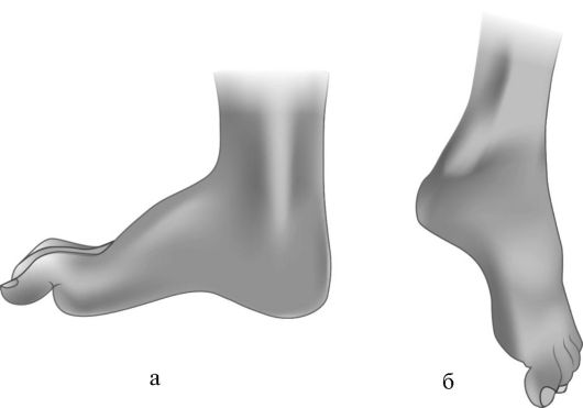 Рис. 8.13. «Пяточная» стопа при поражении большеберцового нерва (а); «свисающая» стопа при поражении малоберцового нерва (б).