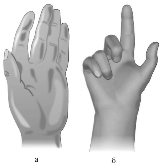 Рис. 8.9. Признаки поражения локтевого нерва: когтеобразная кисть (а), при сжатии кисти в кулак V и IV пальцы не сгибаются (б).