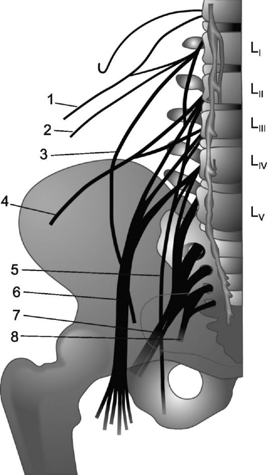 1 - подвздошно-подчревный нерв; 2 - под- вздошно-паховый нерв; 3 - бедренно-половой нерв; 4 - латеральный кожный нерв бедра; 5 - запирательный нерв; 6 - бедренный нерв, 7 - седалищный нерв; 8 - половой нерв.