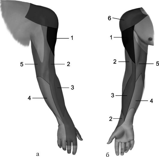 6. Кожный внутренний нерв плеча (n. cutaneus brachii medialis, CYIII-ThI) - чувствительный, отходит от медиального пучка плечевого сплетения, на уровне подмышечной ямки имеет связи с наружными кожными ветвями (rr. cutani laterales) II и III грудных нервов (nn. thoracales) и иннервирует кожу медиальной поверхности плеча до локтевого сустава (рис. 8.4).